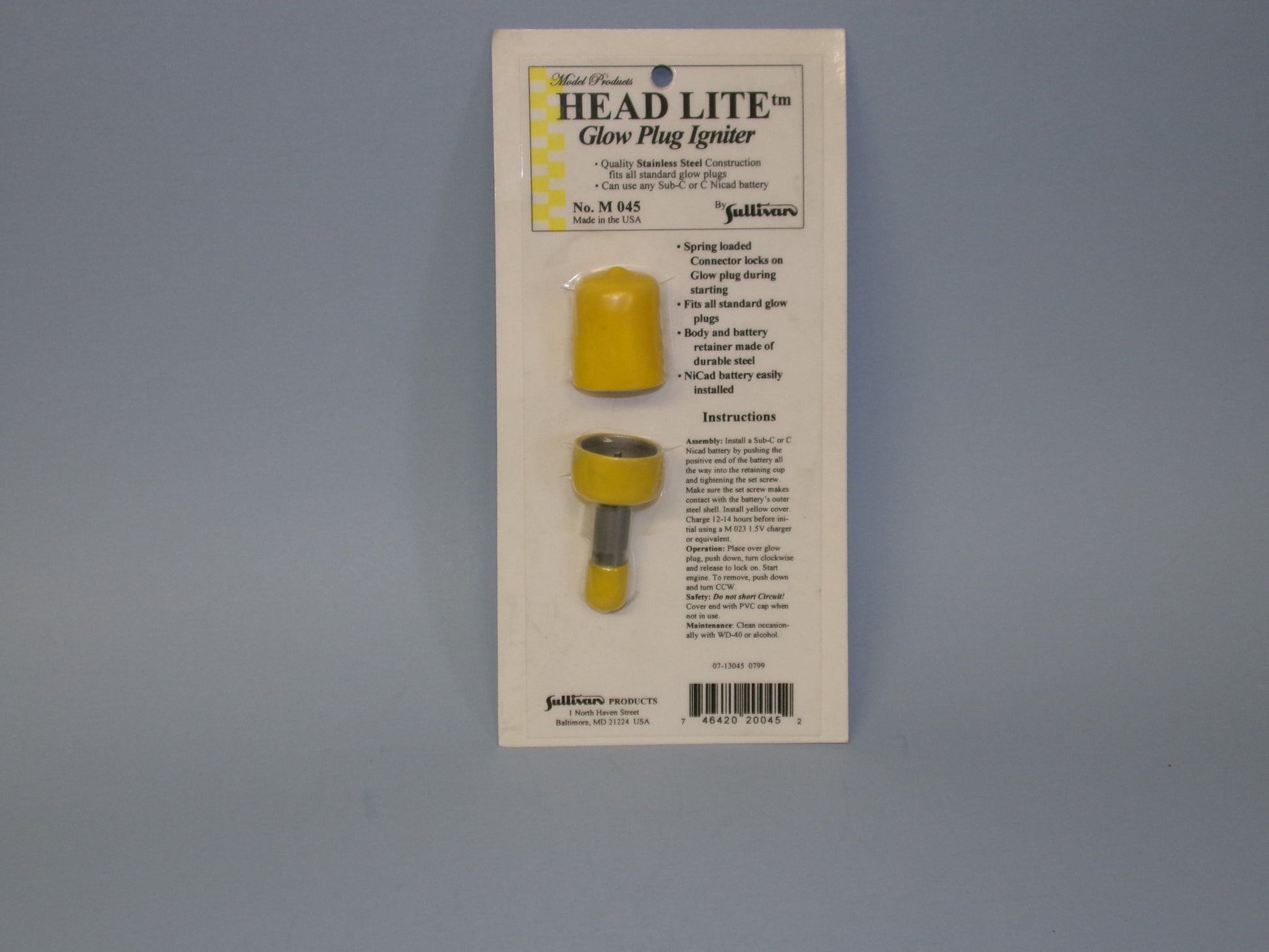 M045- Head Lite glow plug igniter. Utilizes our HeadLock push and twist to lock onto glow plug. You only need to provide a Sub C or C NiCad battery.