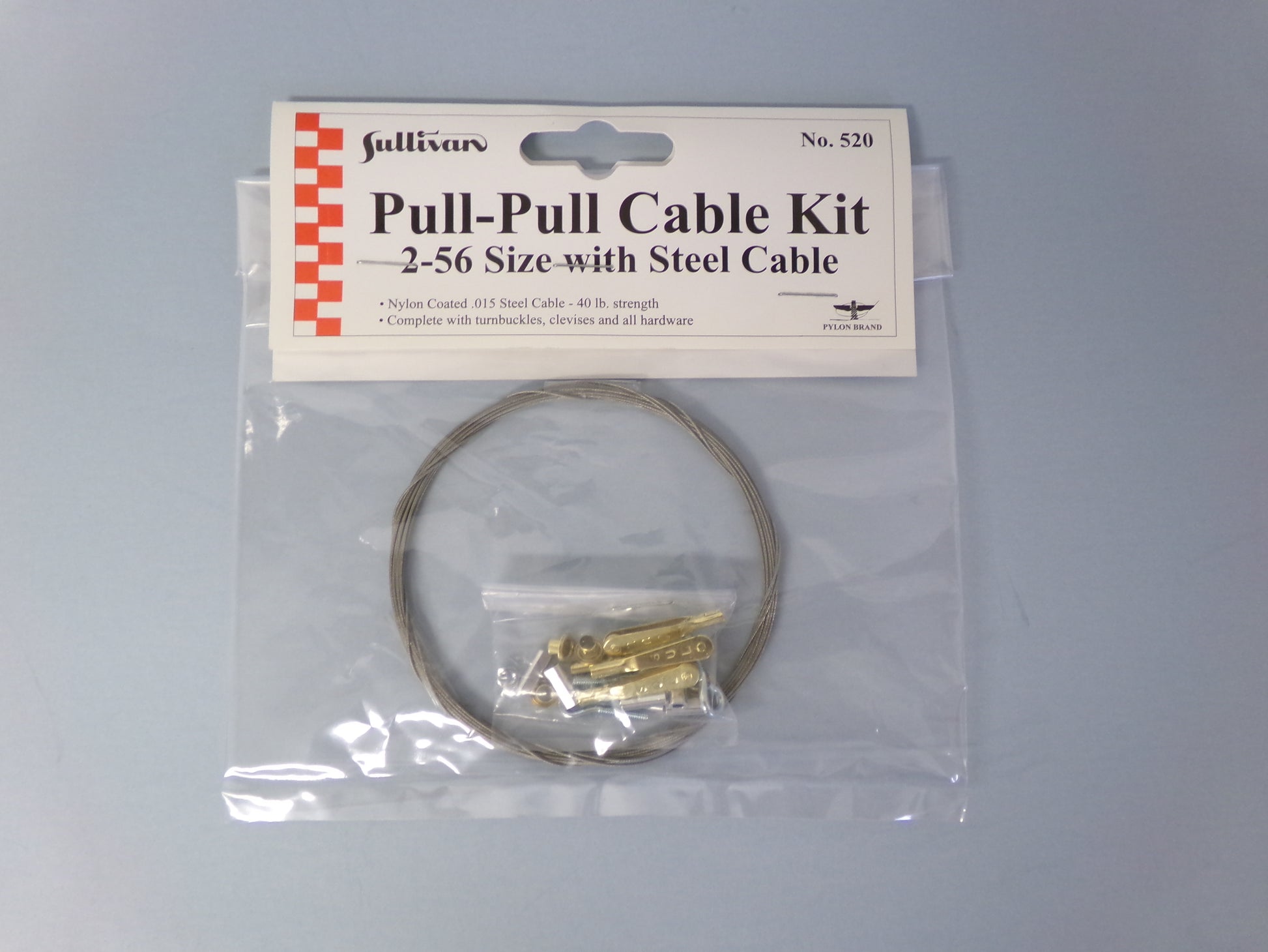 S520- Steel cable pull pull kit comes with all Gold-N-Clevises and hardware needed to complete one pull pull. Cable is .015" stranded stainless steel rated at 40 lb test strength and comes 15' long.