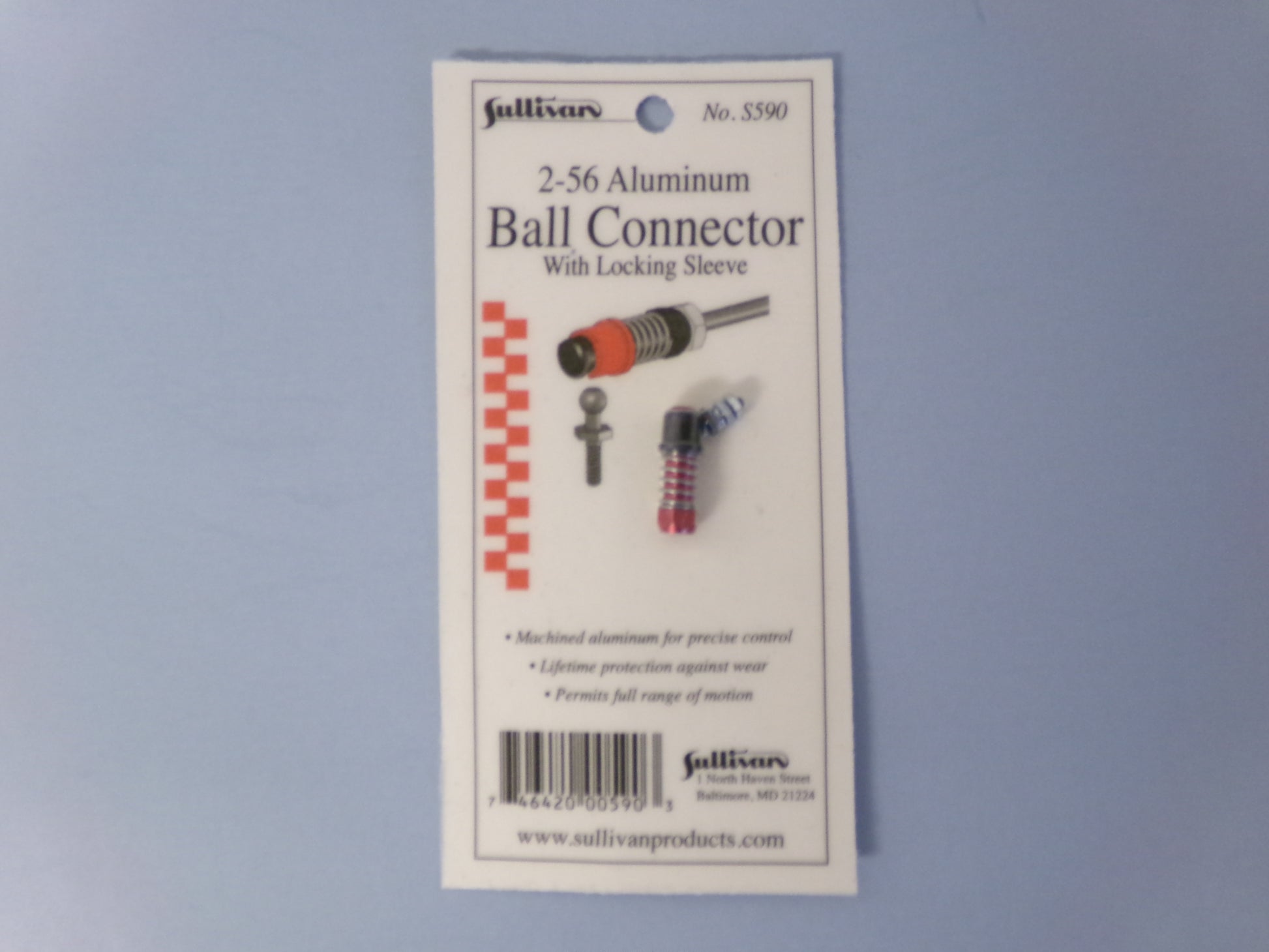 S590- 2-56" Aluminum ball connector (2-56" rod and ball stud) permits off-axis operation with a full range of motion. Spring loaded steel sleeve holds plated steel ball firmly in place yet allows for quick easy release for adjustments. Quick release requires no tools. Once installed the ball joint gives NO play in the control system.