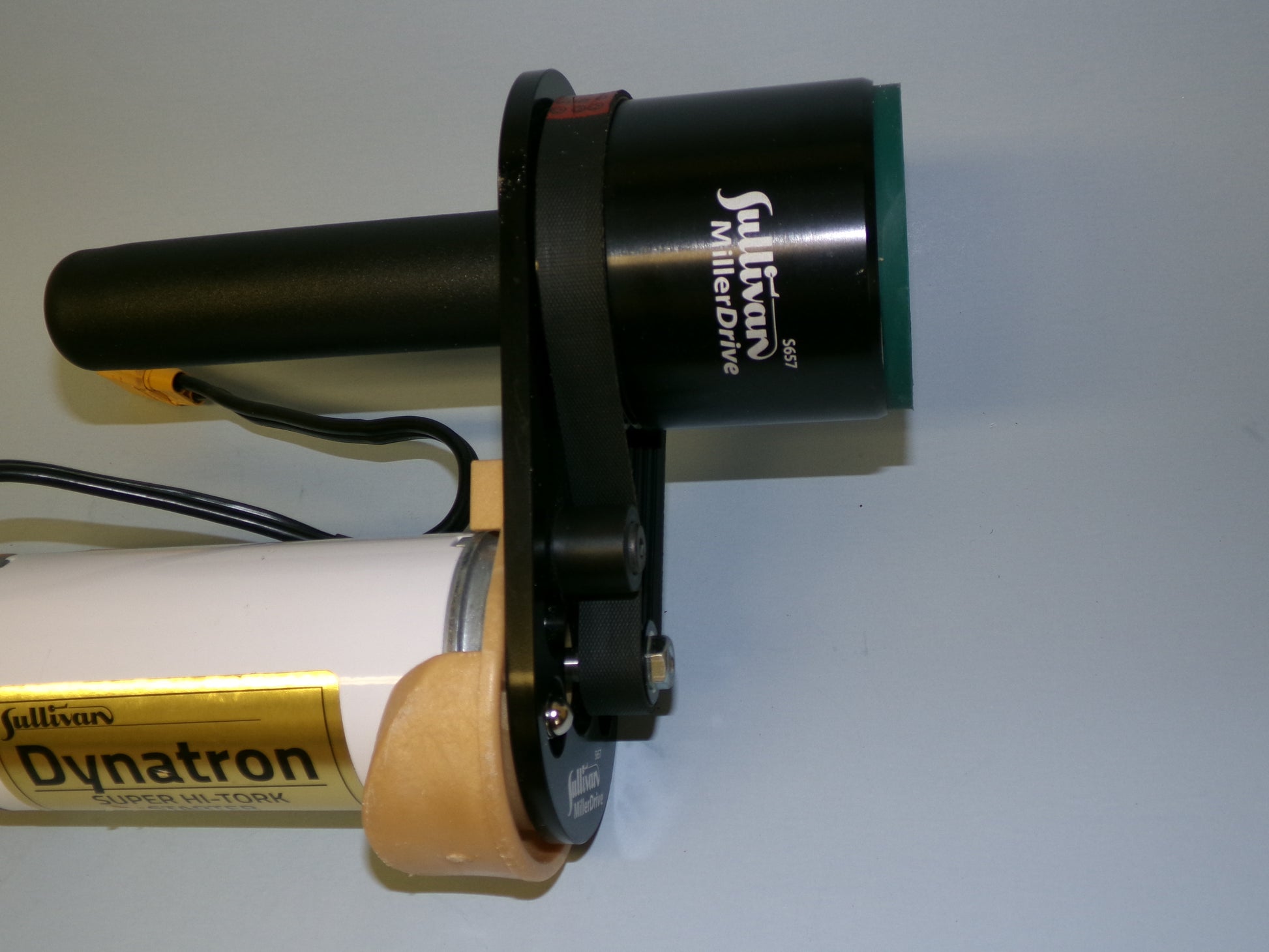 S657- MillerDrive gear reduction unit. Based on the tried and true, Miller RC- "Persuader". With Hap Miller's approval, we re-engineered it for today's gas engines. Quickly and easily fits both the HIghTork and Dynatron starters. Comes with 3" aluminum cone and a 3" silicone insert to allow for increased gripping surface on large spinners. 4:1 gear reduction for high torque at low RPM. Uses a 6 rip Poly V belt commonly found on most tabletop planers and saws. All machined aluminum and Delrin construction. Starts up to 120cc engines when mounted to our HighTork starter and up to 150cc engines when mounted to our Dynatron starter.