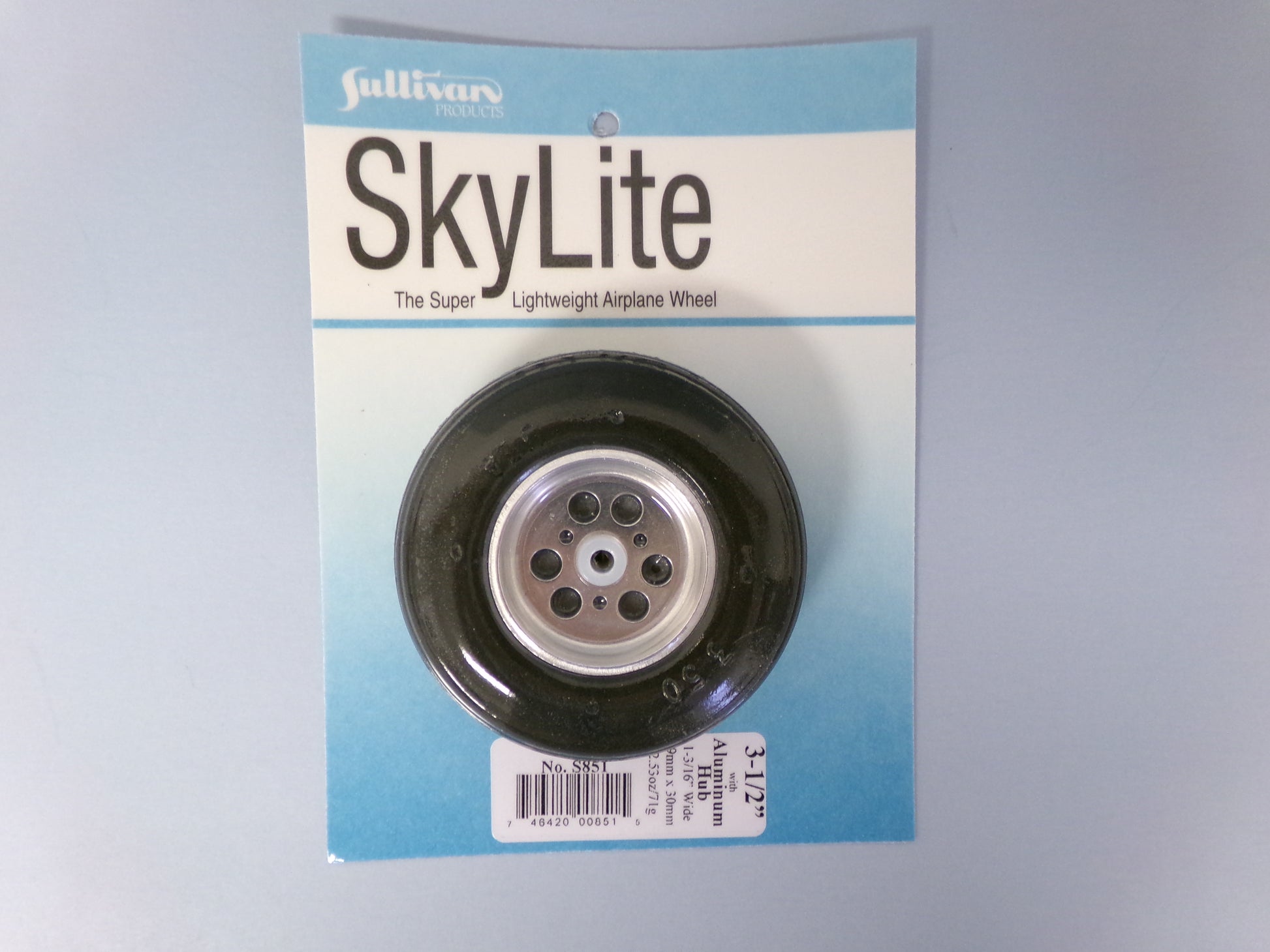S851- 3.5" SkyLite lightweight wheel with two-piece removable aluminum hub has a Delrin center bearing designed for a 3/16" axle. The bearing can be drilled bigger to accommodate larger axle. Packaged individually.