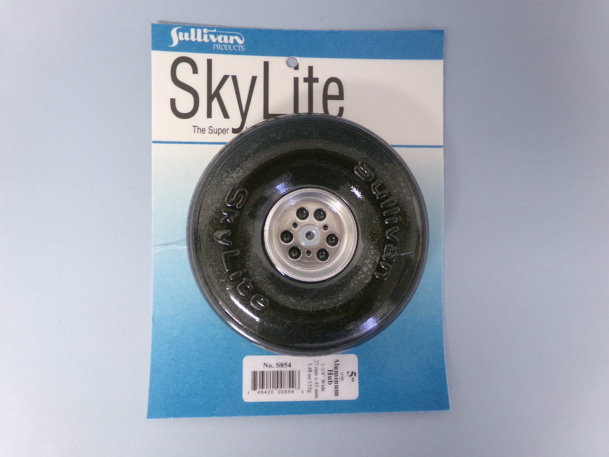 S854- 5" SkyLite lightweight wheel with two-piece removable aluminum hub has a Delrin center bearing designed for a 3/16" axle. The bearing can be drilled bigger to accommodate larger axle. Packaged individually.